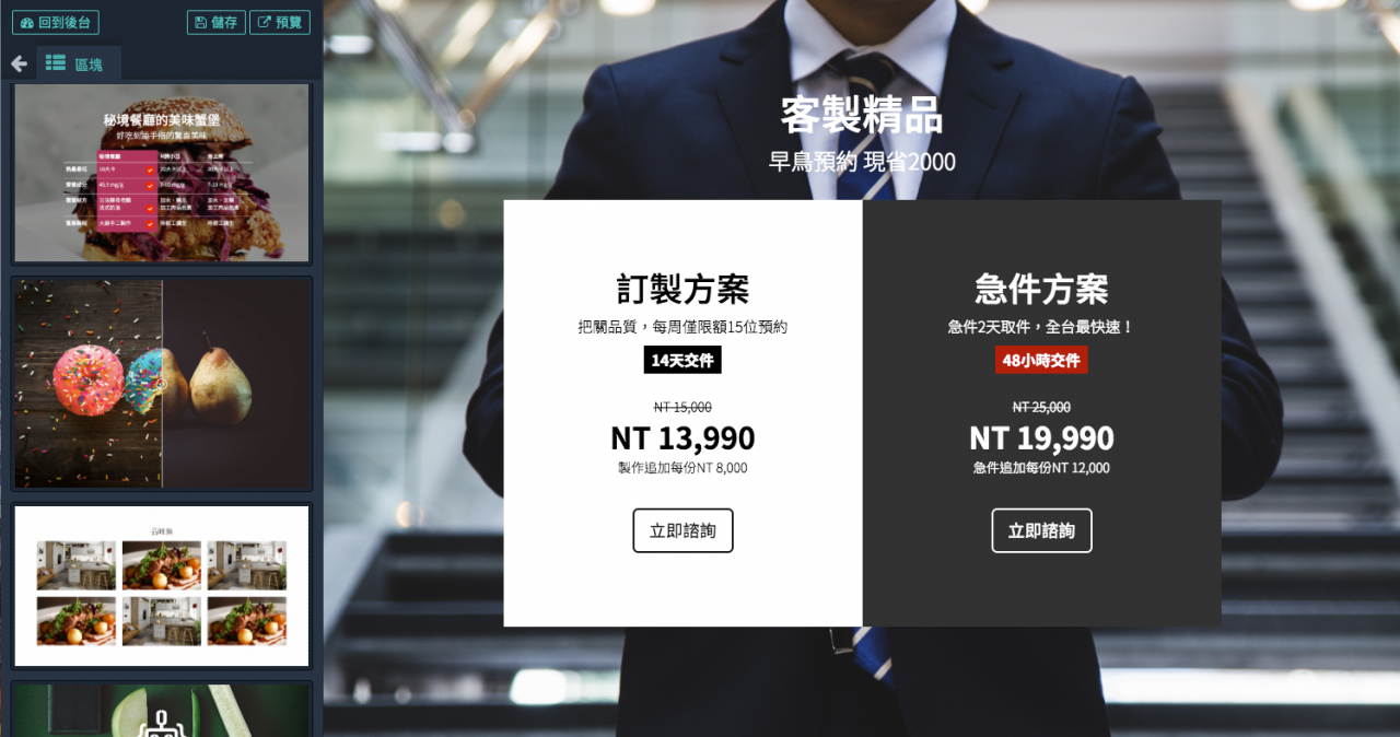 銷售模組 用適合的模組來突顯商品特色 將顧客衝動轉換成訂單 優劣比較表格 使用前後對照圖 限時倒數 方案比較表 Google地圖 幻燈片輪播 YouTube影片 照片牆 視差滾動 單頁購物車 快速問答 詢問單